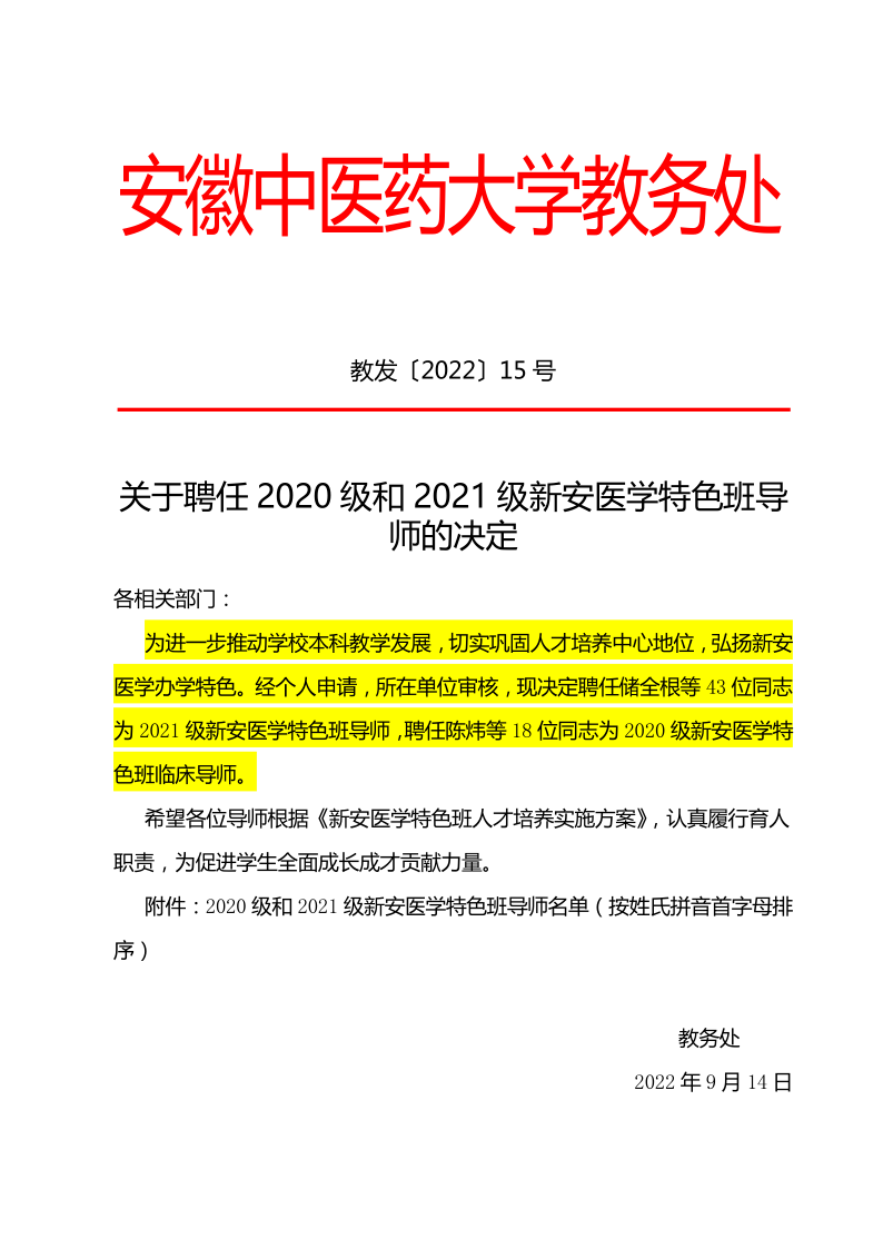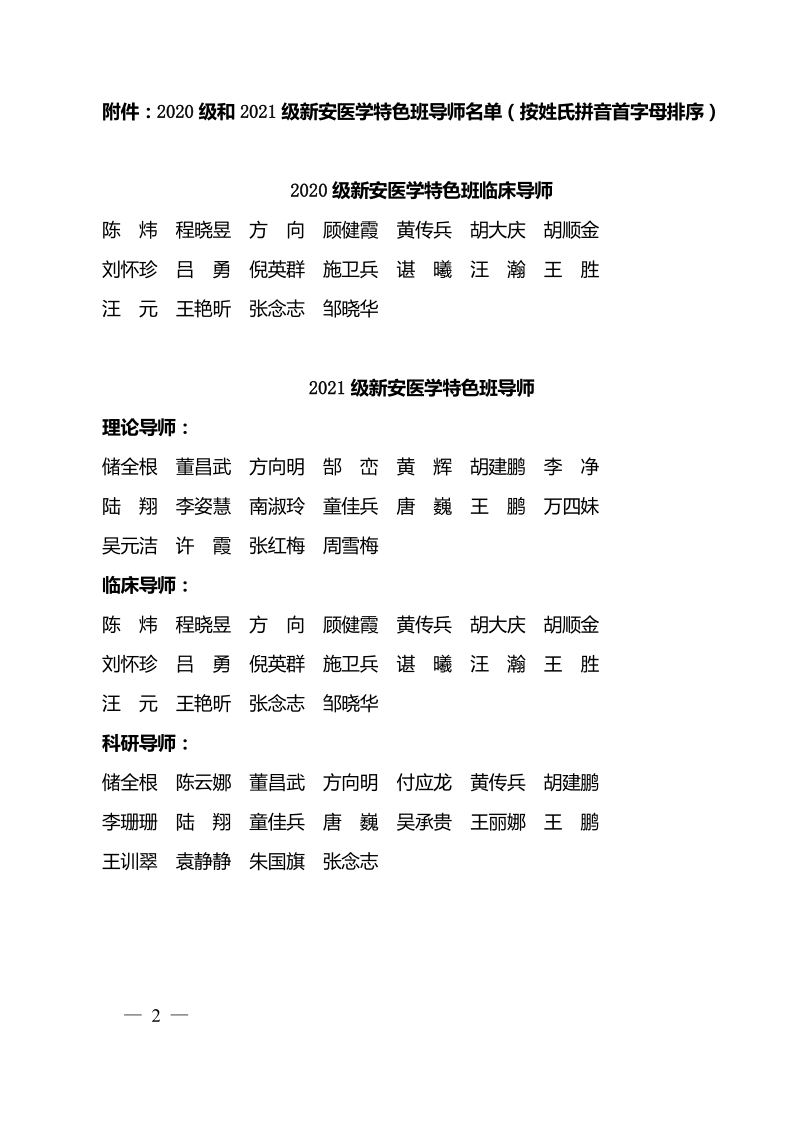 关于聘任2020级和2021级新安医学特色班导师的决定