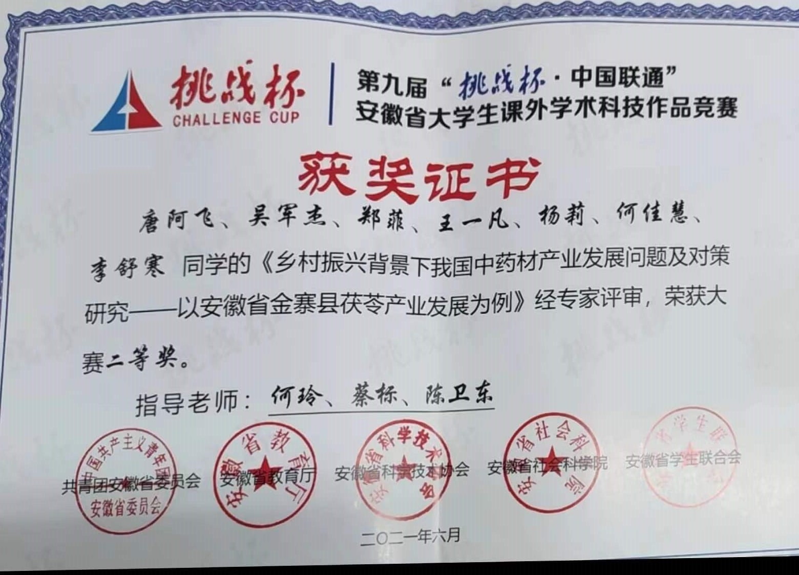 第九届安徽省大学生课外学术科技作品竞赛(何玲指导)