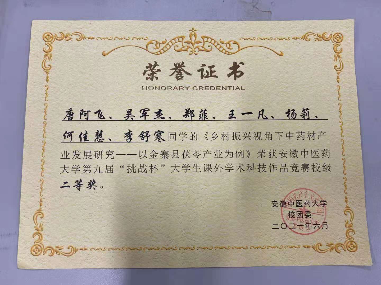 第九届“挑战杯”安徽中医药大学大学生课外学术科技作品竞赛二等奖(何玲指导)