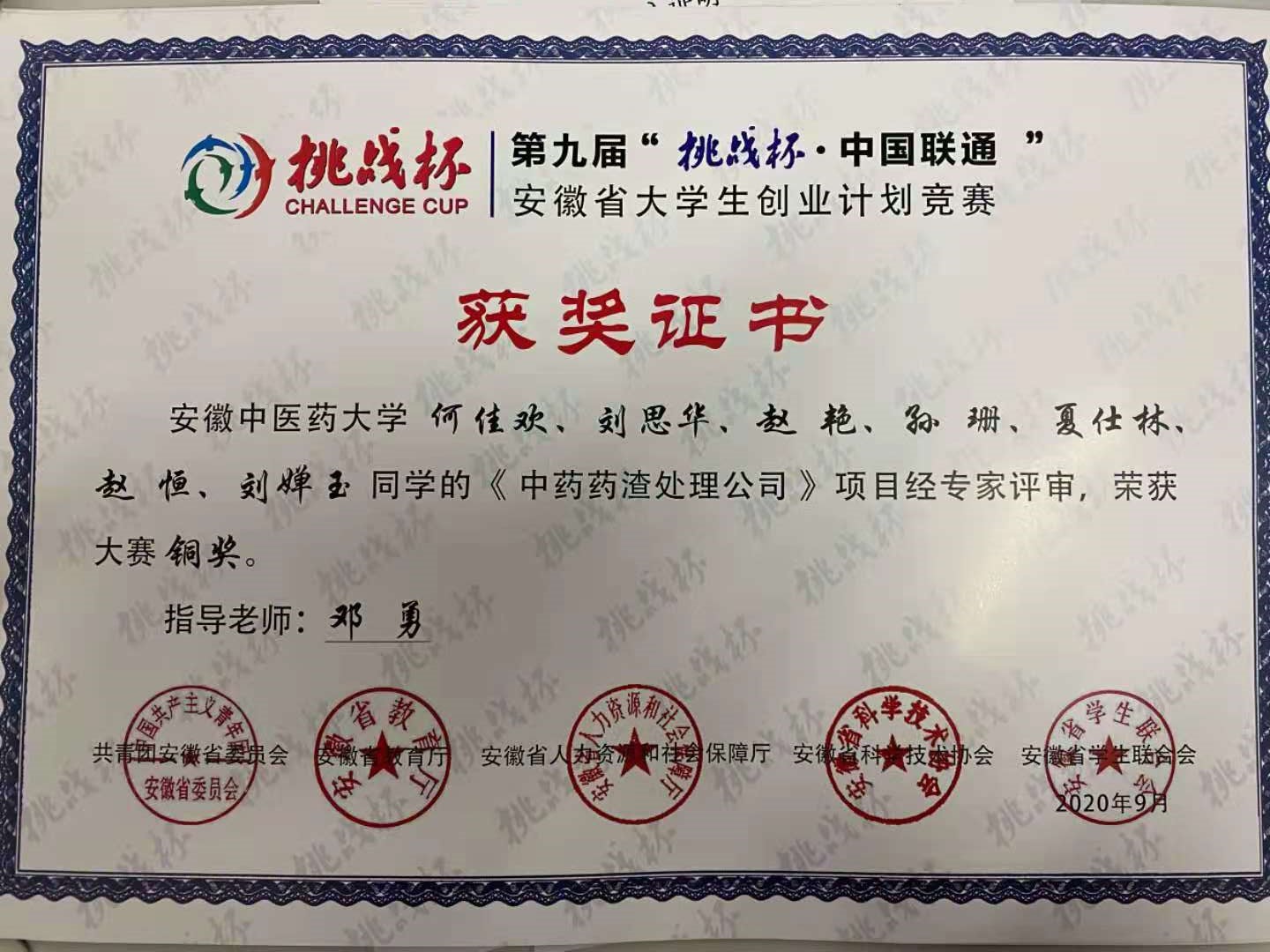 第九届“挑战杯”安徽省大学生创业计划竞赛铜奖(邓勇指导)