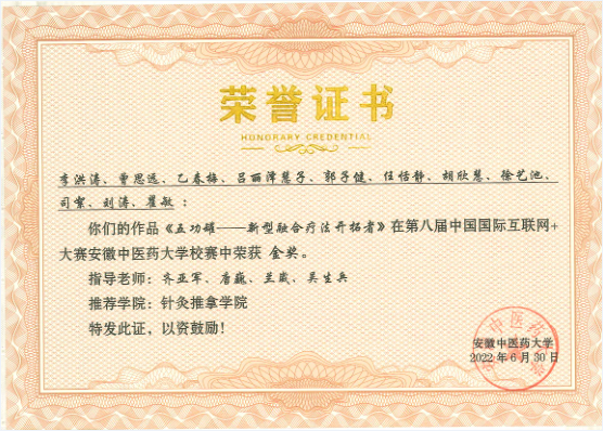 第八届互联网=大赛安徽中医药大学校赛金奖(齐亚军指导)