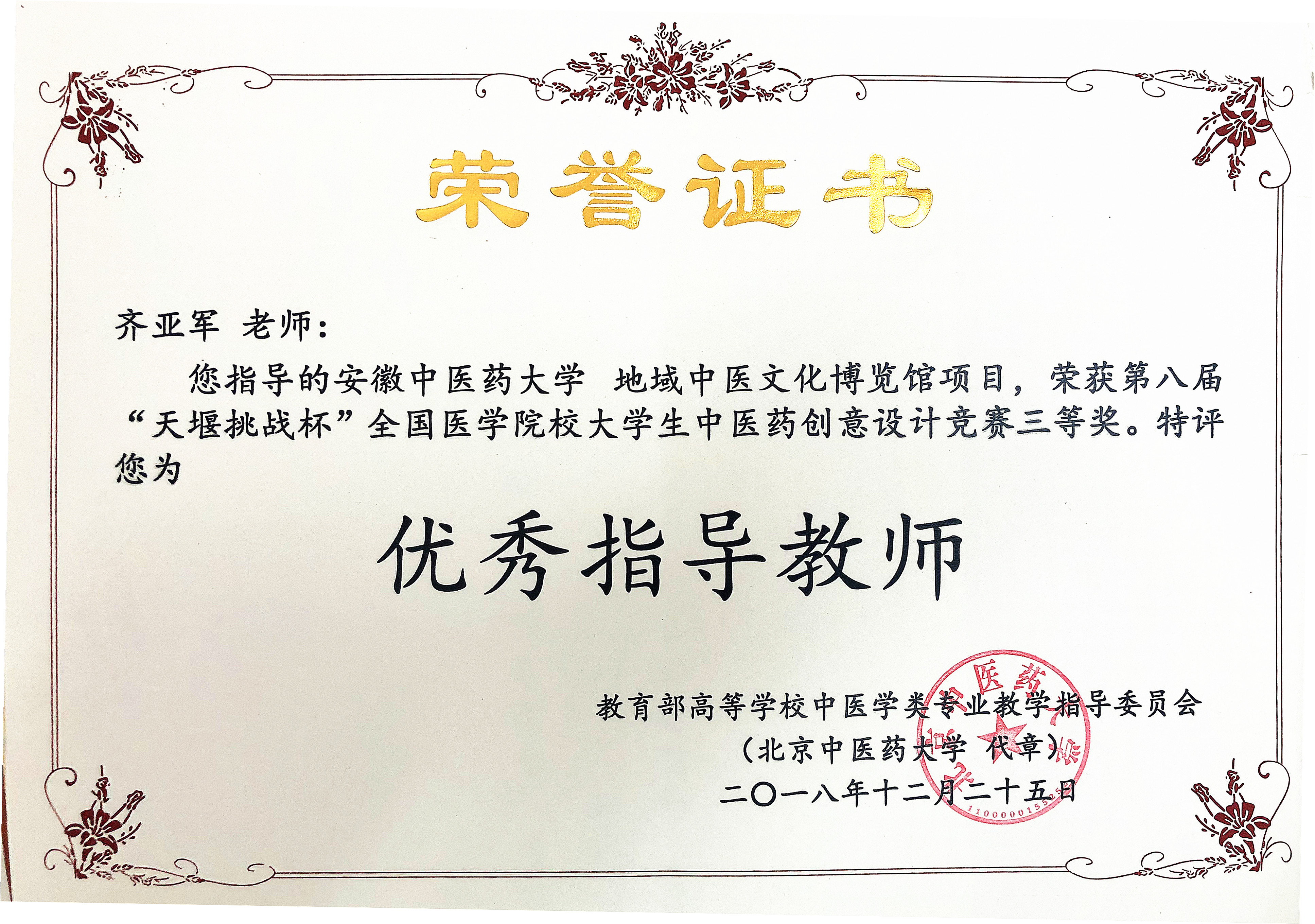 2018年全国天堰杯优秀指导老师齐亚军