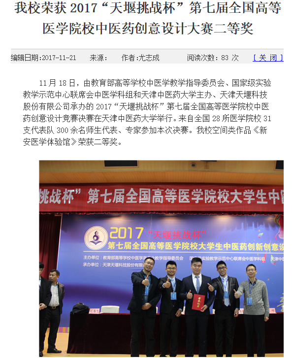 2017“天堰挑战杯”第七届全国高等医学院校中医药创意设计大赛二等奖