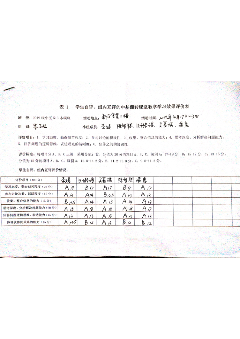 19中医5+3班学生自评、组间互评的中基翻转课堂教学学习效果评价表
