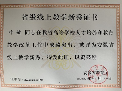 叶敏2020年获安徽省线上教坛新秀奖