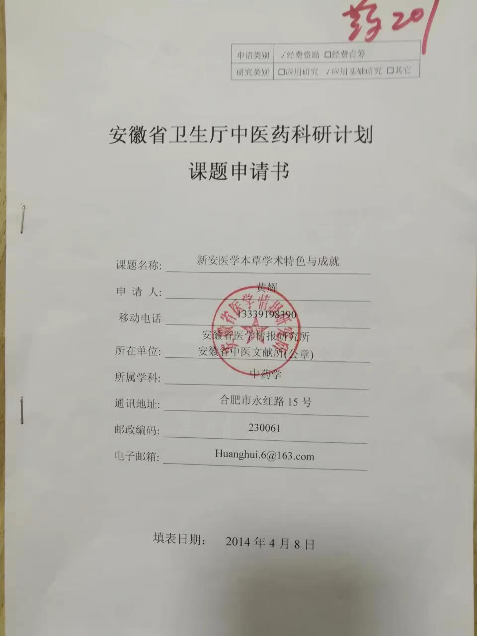 黄辉主持2014年安徽省卫生厅中医药科研计划课题