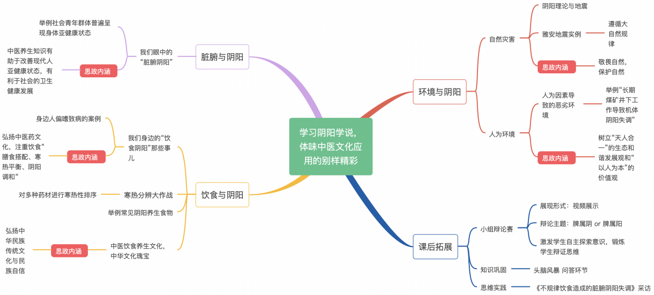 本次课程切入的知识点是“阴阳学说在中医学中的应用”。从“脏腑与阴阳、饮食与阴阳、环境与阴阳”入手,在脏腑阴阳方面,通过举例现代人身体亚健康状态中的阴阳失调,拓展对阴阳的认知,提升学习兴趣;在饮食阴阳方面,从分辨中药性质的小游戏和生活中的案例两方面入手,增加学生在中医学习中的趣味性和代入感;在环境阴阳方面,从雅安地震入手并列举相关事例,启发学生对于环境与以人为本的深入思考,增强中医自信及中华民族传统文化自信,树立中和思维、“天人合一”的生态和谐发展观、“以人为本”的价值观以及人文关怀意识。