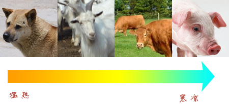 四条腿食用动物(畜)寒热属性 两条腿食用动物(禽)寒热属性 亲水食用动物寒热属性