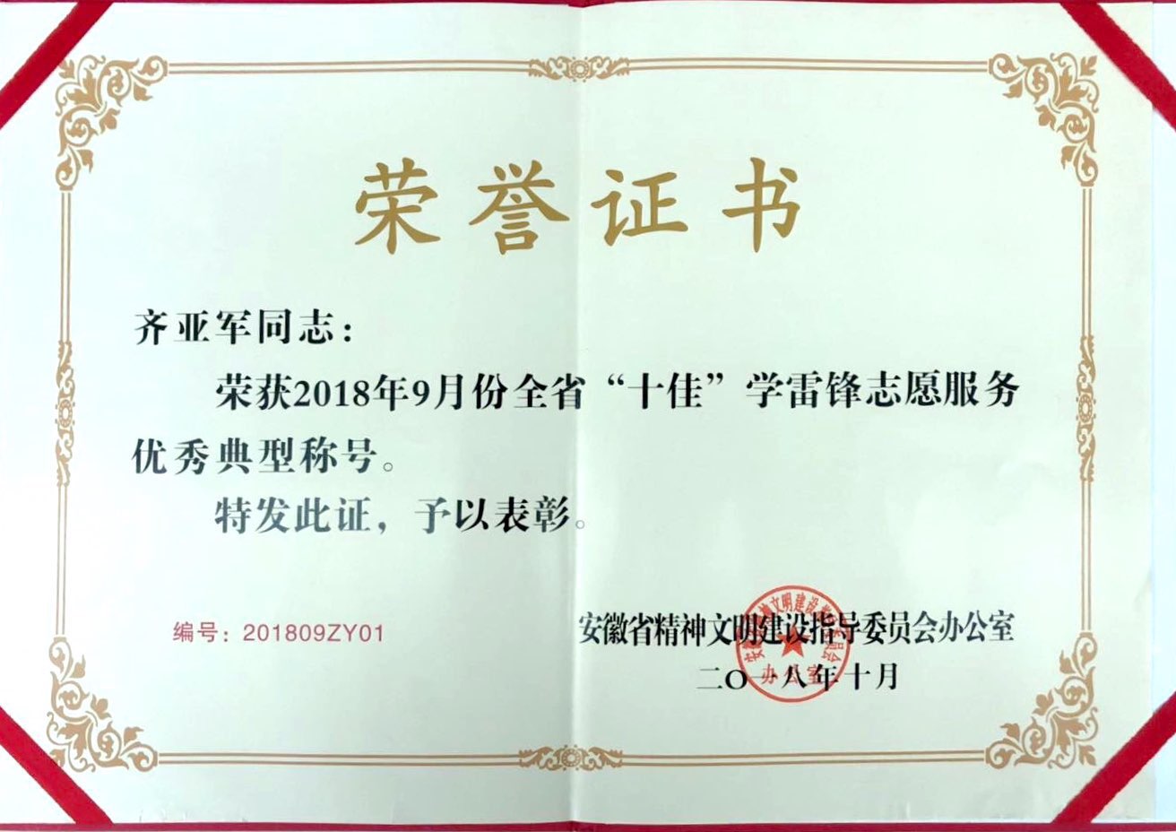 2018年齐亚军被评为省十佳学雷锋志愿服务优秀典型