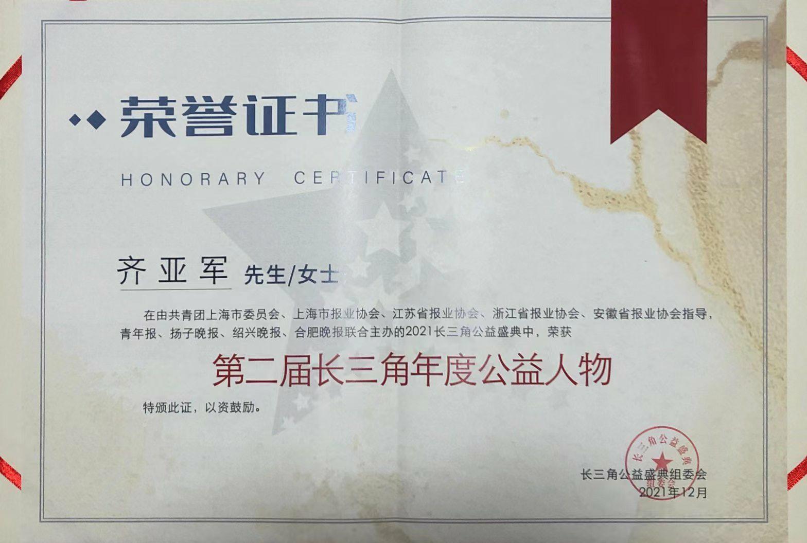 齐亚军被评为第二届长三角年度公益人物