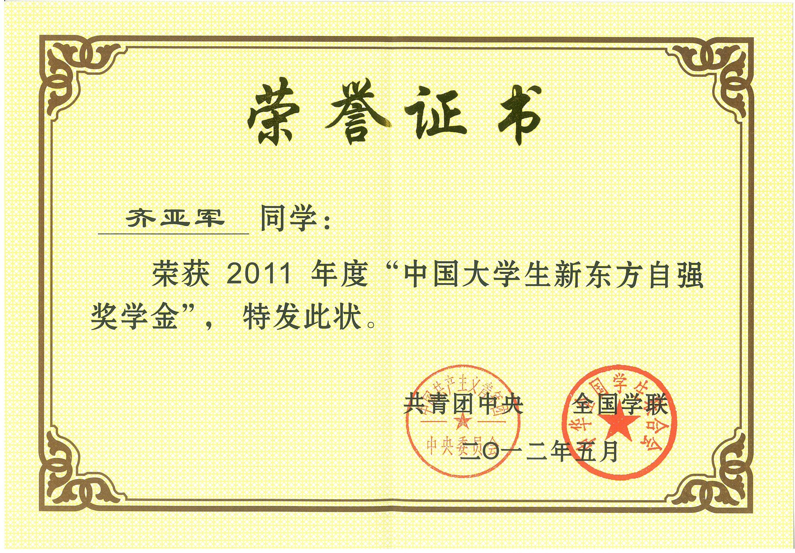 齐亚军被评为全国大学生自强之星