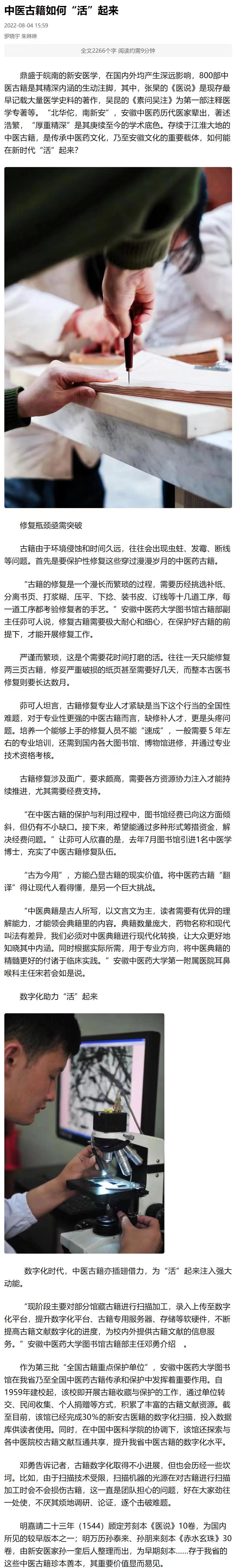 安徽中医药大学古籍部古籍修复及古籍数字化进展报道