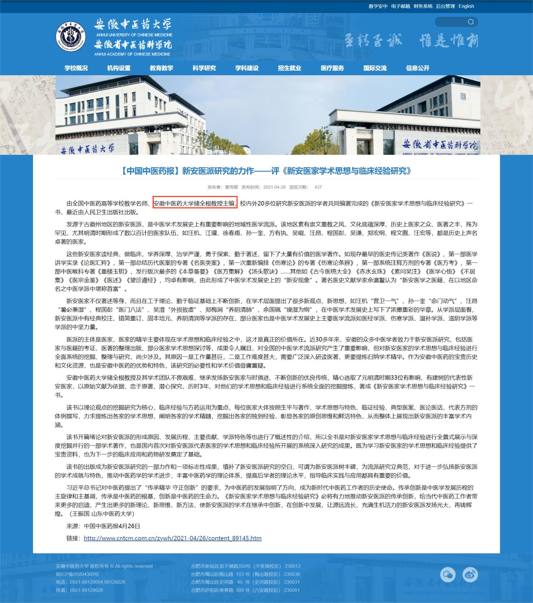 中国中医药报评《新安医家学术思想与临床经验研究》 为新安医派研究的力作