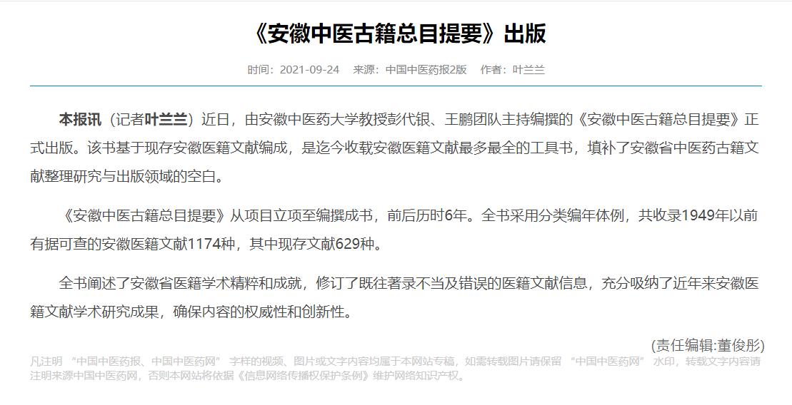 《安徽中医古籍总目提要》出版-中国中医药报报道