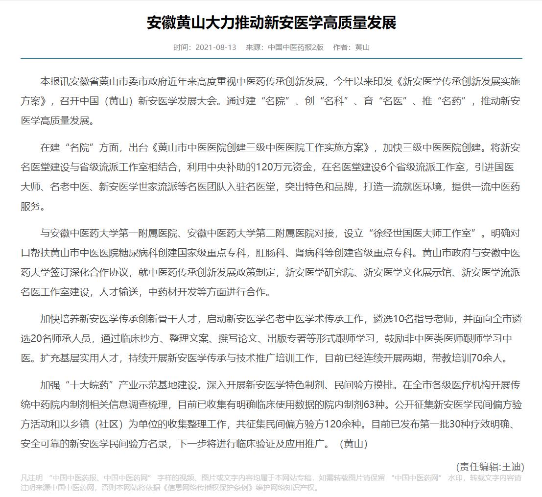 安徽黄山大力推动新安医学高质量发展-中国中医药报报道