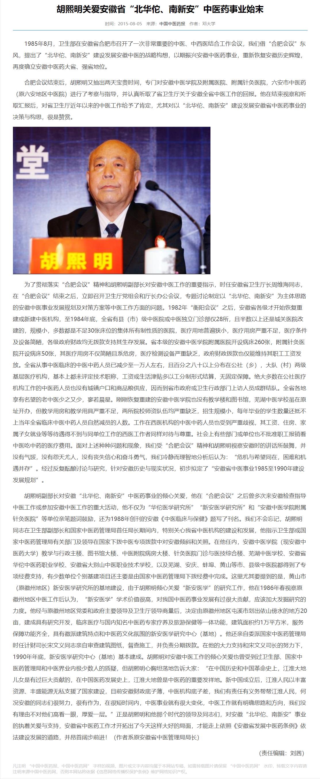 胡煦明关爱安徽省“北华佗、南新安”中医药事业始末-中国中医药报报道