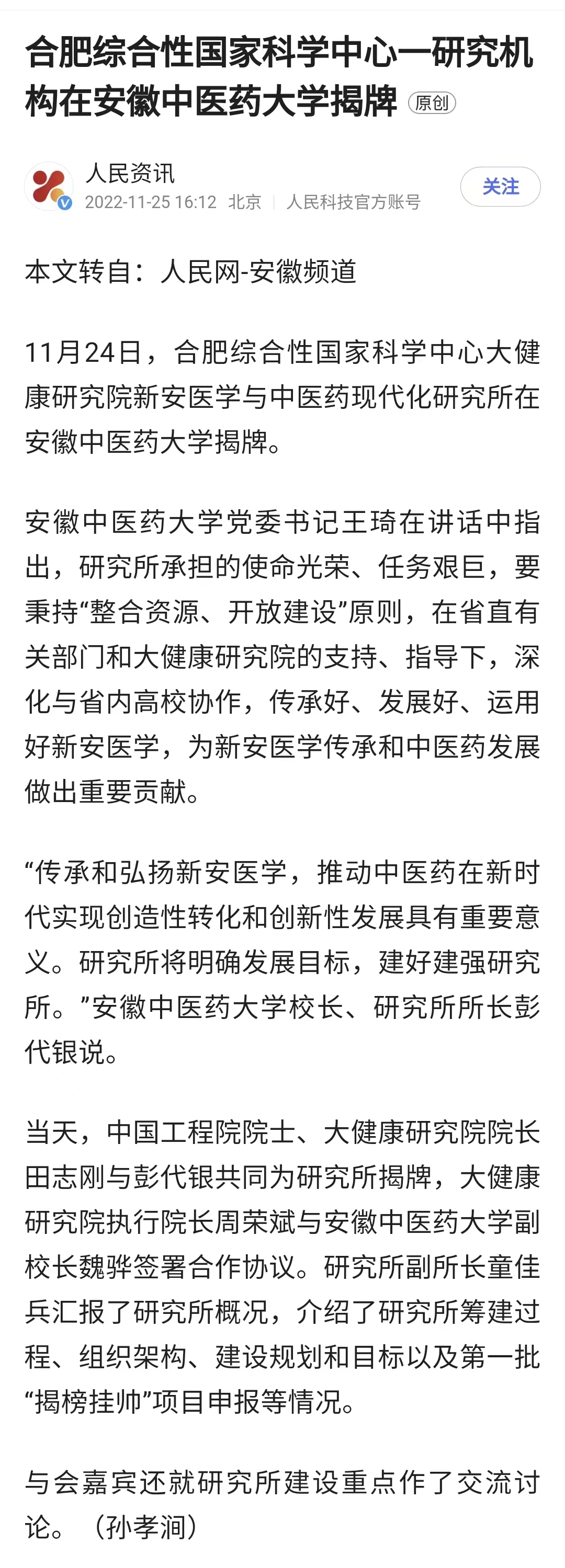 合肥综合性国家科学中心—研究机构在安徽中医药大学揭牌
