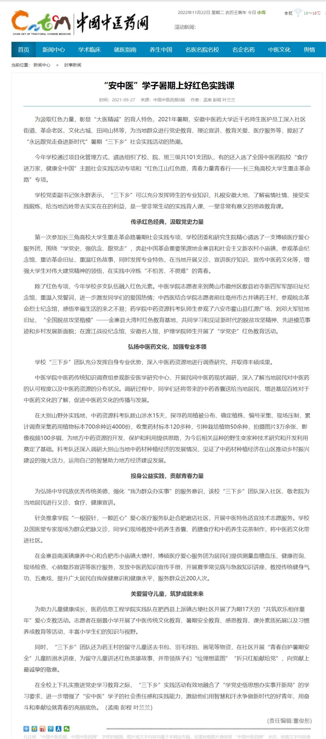 中国中医药网报道我校学子暑期上好红色实践课