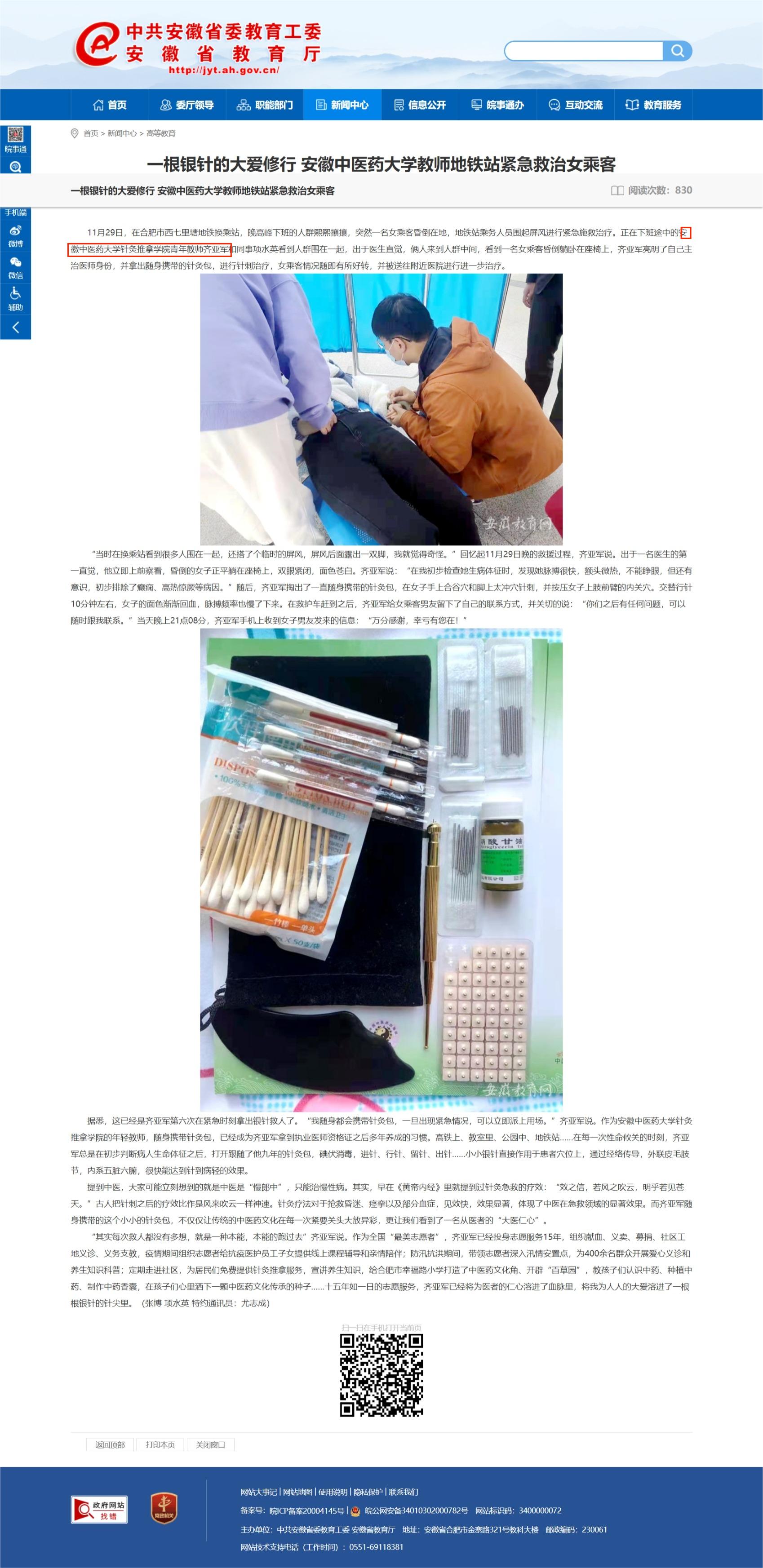 安徽省教育厅官网报道课程教师齐亚军用医术救人
