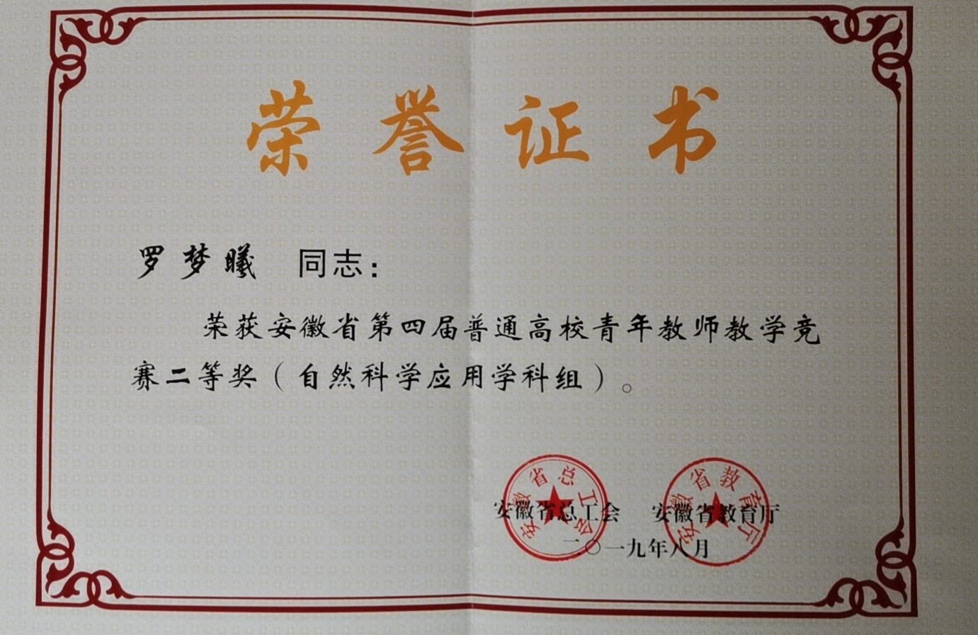 罗梦曦获安徽省第四届普通高校青年教师教学竞赛二等奖