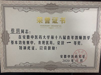 蔡玥获安徽中医药大学第十八届青年教师教学基本功竞赛一等奖