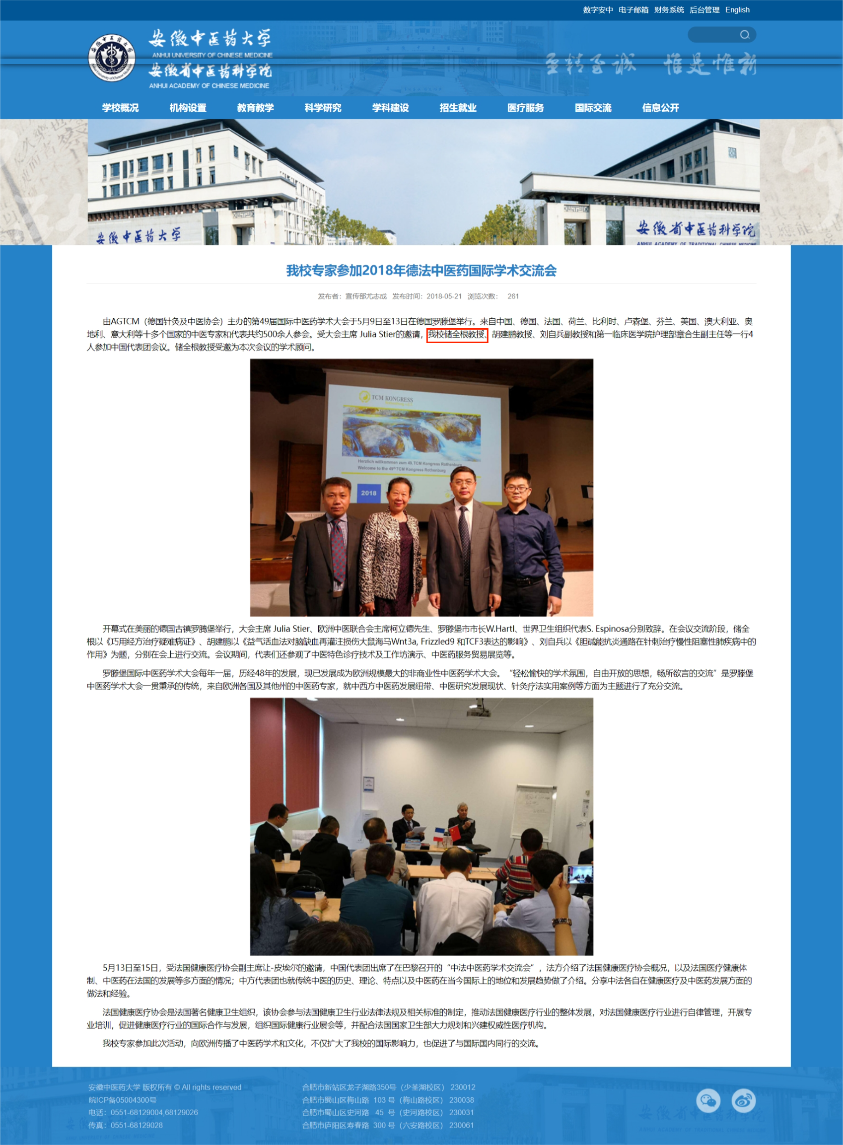 储全根教授参加2018年德法中医药国际学术交流会议(安徽中医药大学官网)