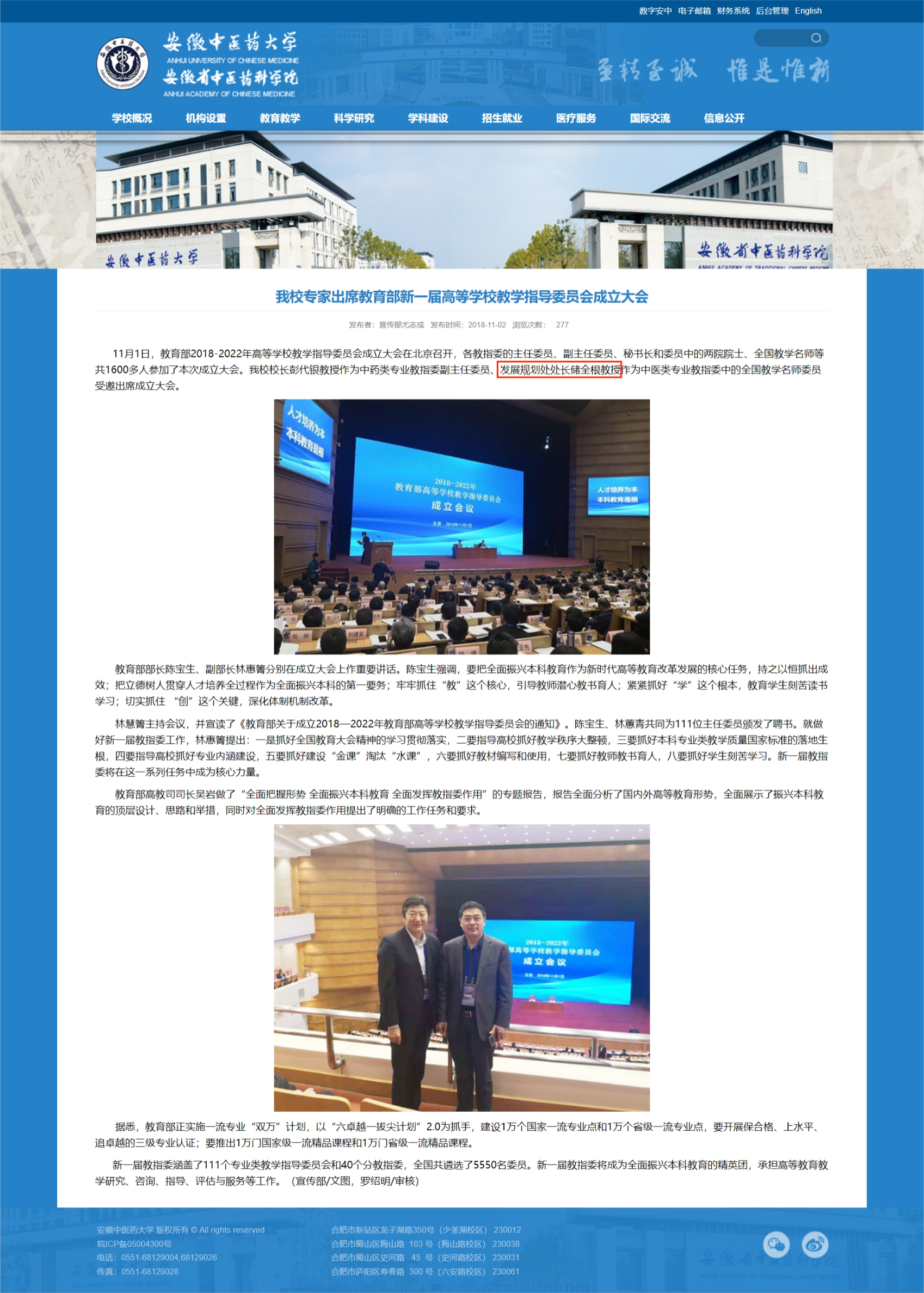 储全根教授出席教育部新一届高等学校教学指导委员会成立大会(安徽中医药大学官网)