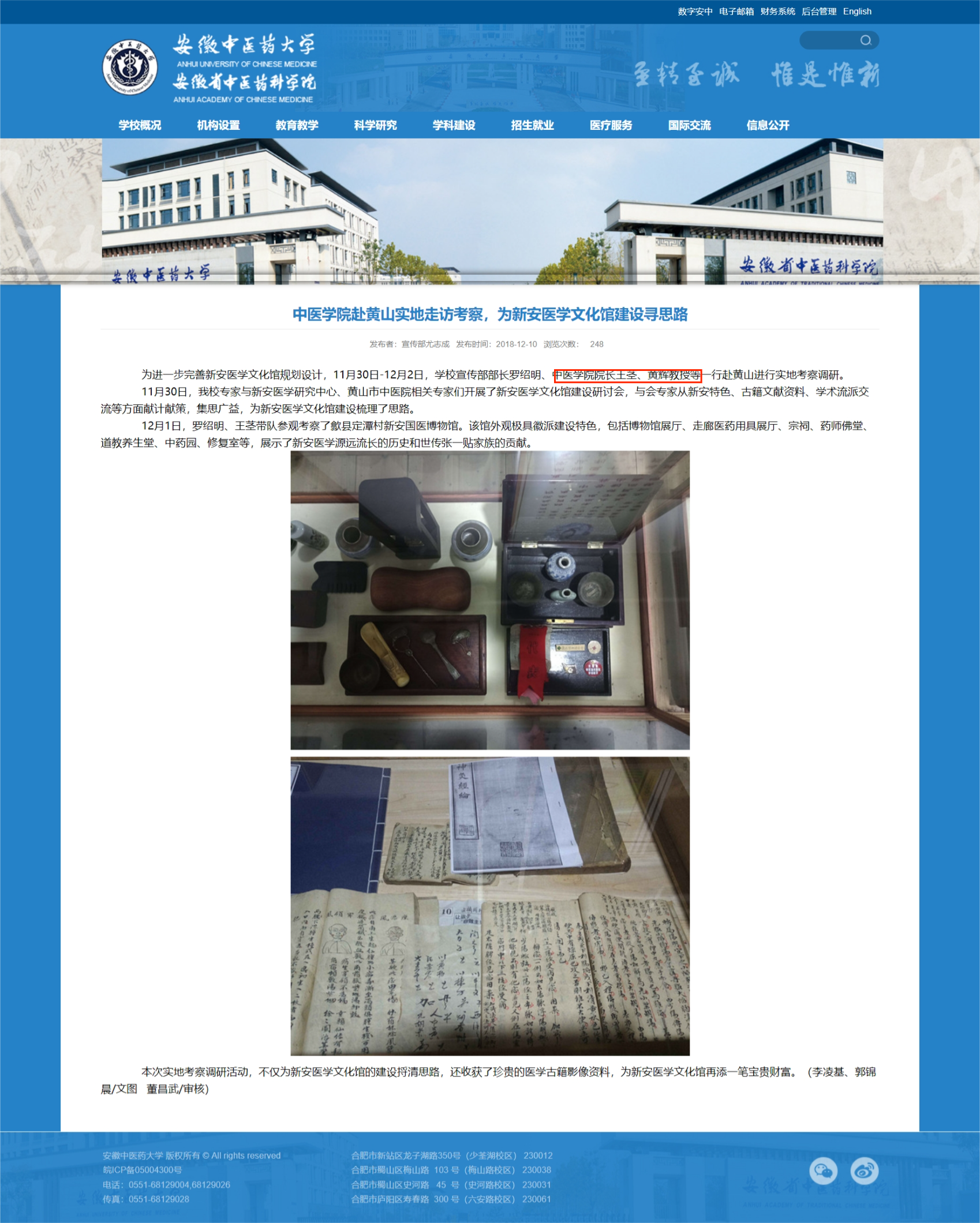王茎教授、黄辉教授参加新安医学文化管建设调研会(安徽中医药大学官网)