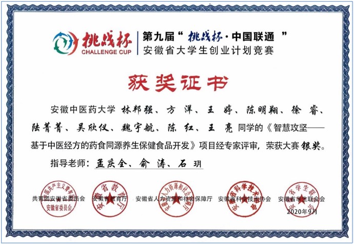 安徽省大学生“挑战杯”课外学术科技作品竞赛银奖
