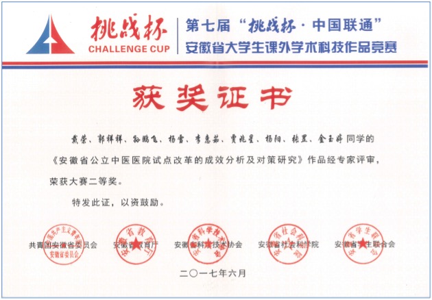 安徽省大学生“挑战杯”课外学术科技作品竞赛二等奖
